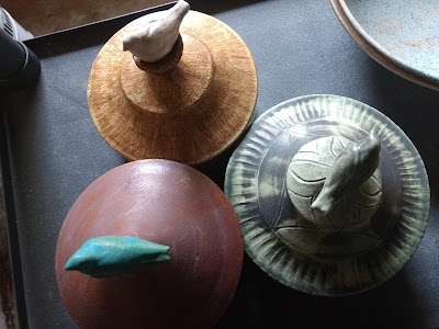 These little, um, bird objects below have been in the glaze firing, but are not glazed, only decorated with colored slips. More to happen with these, as far as mounting/display. I have about a dozen ideas, and hope the one I go with will realistically be within my skill set. Have to remind myself that I am not a cabinet maker. Stay tuned.